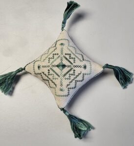 Sampler Stitch Pincushion and Scissor Fob: This little pincushion and fob will teach you more than just the standard cross stitches. Stitches included Rhodes, four side filling, long arm cross, Smyrna, open herringbone, and Ray stitch. A variegated floss, color of your choice, on a neutral 32 count linen is used. Four little tassels are made on each corner. A simple project with an array of different stitches to learn. Saturday 3/21 and 3/28 11-2 $35.00. Bring a 4″ hoop. All other supplies provided.