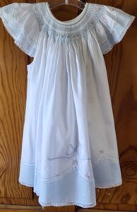 Baby Brooke: This is one of my favorite bishops. This bishop dress made from satin batiste features a scalloped lace insertion at the hemline with a contrasting band and delicate feather stitch and a shadow worked bow. There is also a contrasting band on the angel sleeve with embroidery, lace insertion, and edging. Color of fabric and floche for smocking and embroidery is your choice. All materials provided. 3/11, 3/18, 3/25, 4/1. 11-3 $85.00.