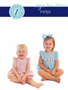 Piper: This new pattern from Children’s Corner features a sleeveless bubble with a ruffle over the shoulder. It can be either smocked or not. What a great project for a summer outfit. Size 3 mo to 24 mo. Use one of my summer prints for a sweet bubble. 4/8, 4/15, 4/22. 11-3. $55.00. Includes all fabric, piping notions, and pattern.